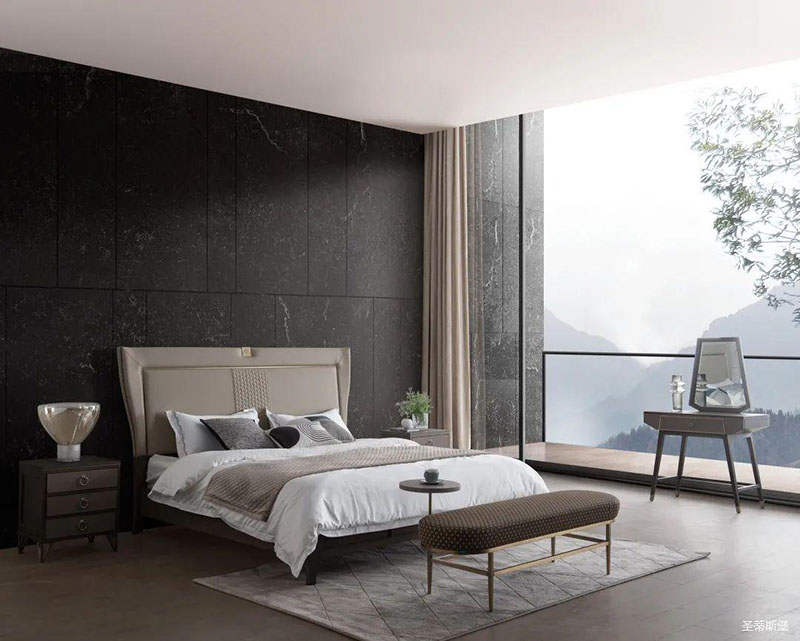 次卧床头背景沿用了暗色大理石护墙,空间层次分明,简约时尚的米色床屏糅合金属镶嵌与真皮编织艺术,看似舒适随意,却在极简中透着淡淡的奢华感。大面积的落地窗让自然光倾入室内,拉上与床屏同色系的窗帘,令次卧的室内空间明暗有度。