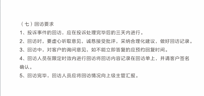 并将有客户签名的售后跟踪单交给店长。店长根据处理完成结果登记存档,并对客户进行回访,确定售后处理完成,并了解客户对公司整个服务过程的满意情况。作为对维修处理人员的考核内容之一。