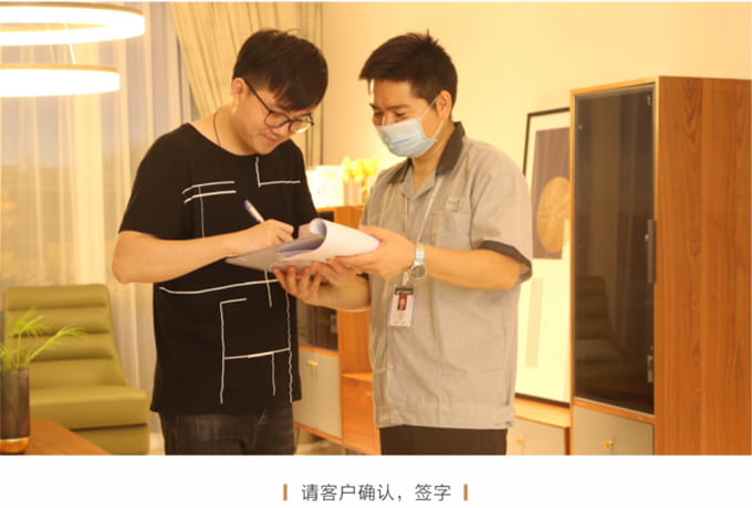 安装并检查完所有工作后,需与客户清点并确认产品,将所有带电源的家具插上电源,告知客户家具使用方法和功能及保养知识、注意事项等。所有带功能的产品需演示给客户看。例: