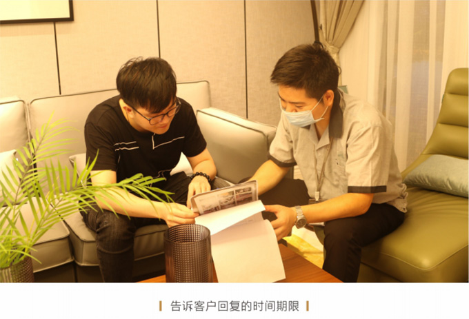 上门现场查看情况后,确定是补件或维修或返厂,并告知客户大概需要多久时间能够解决完问题并真诚地表示歉意。
